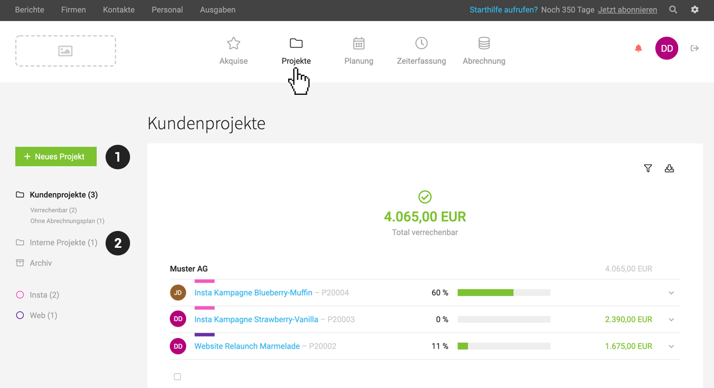 In dieser Phase brauchst du keine echten Daten importieren oder Layouts final einrichten. Es geht nur darum, ein Gefühl für die Software zu entwickeln und zu prüfen, wie MOCO zu euren Prozessen passt. Daher ist es in diesem Schritt auch bereits sinnvoll, Tools für unsere Integrationsmöglichkeiten anzubinden, mit denen ihr in Zukunft weiterhin arbeitet möchtet.