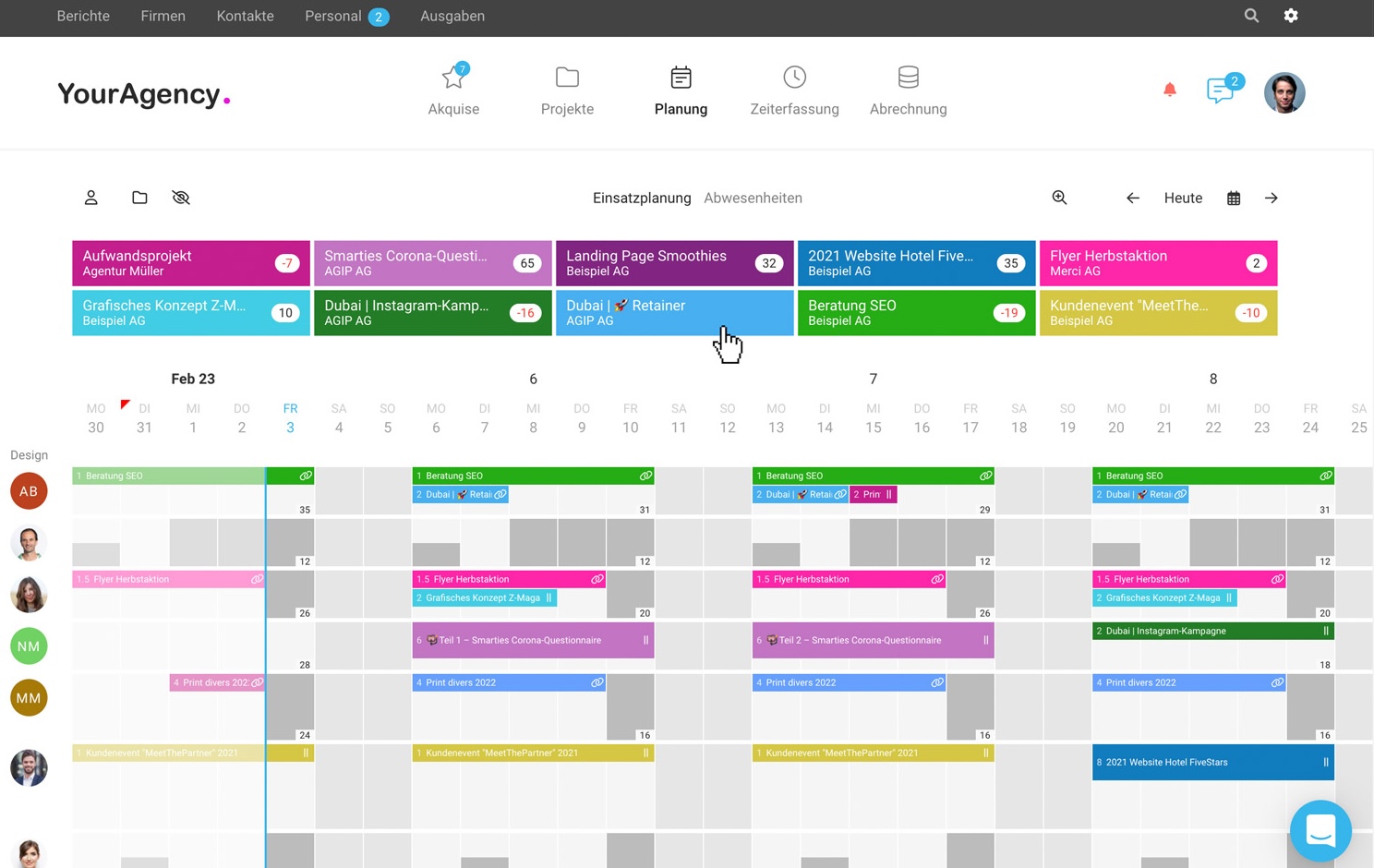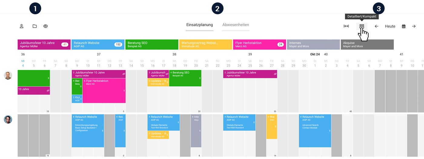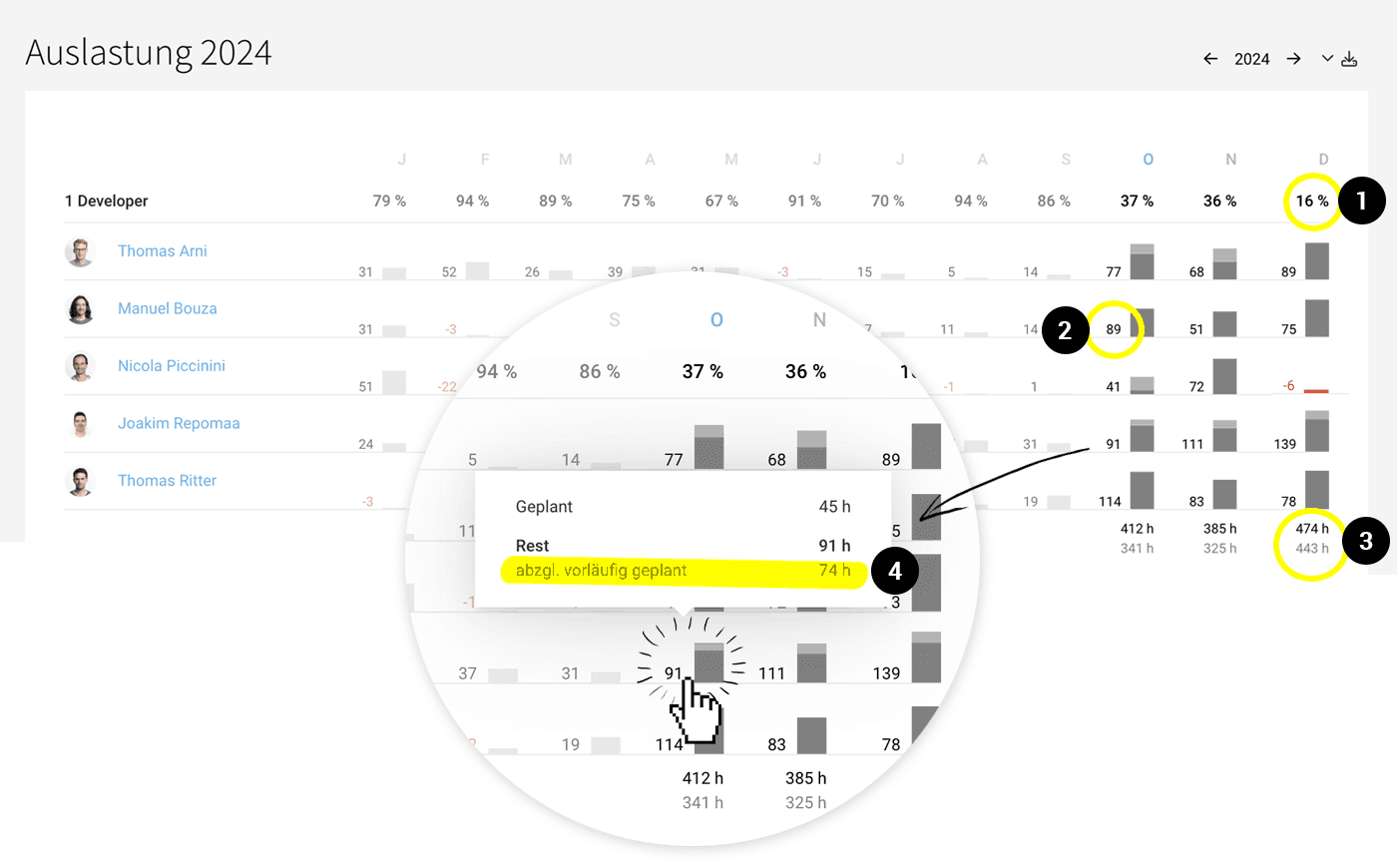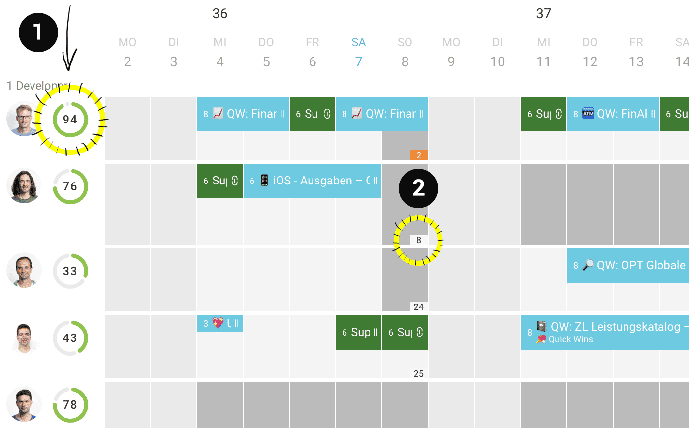 Hier hilft dir in MOCO ein Blick auf die Auslastung pro Person. Direkt in der Planung bietet dir die Übersicht eine schnelle Info zur aktuellen Auslastung und verbleibenden Kapazitäten.