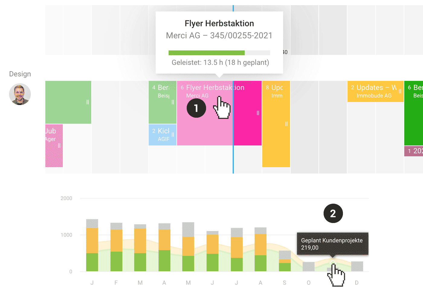 Diese Planung sollte regelmässig überprüft werden. Nur so erkennst du, wenn Projekte aus dem Ruder laufen oder Mitarbeitende nicht wie geplant auf ein Projekt gebucht haben.