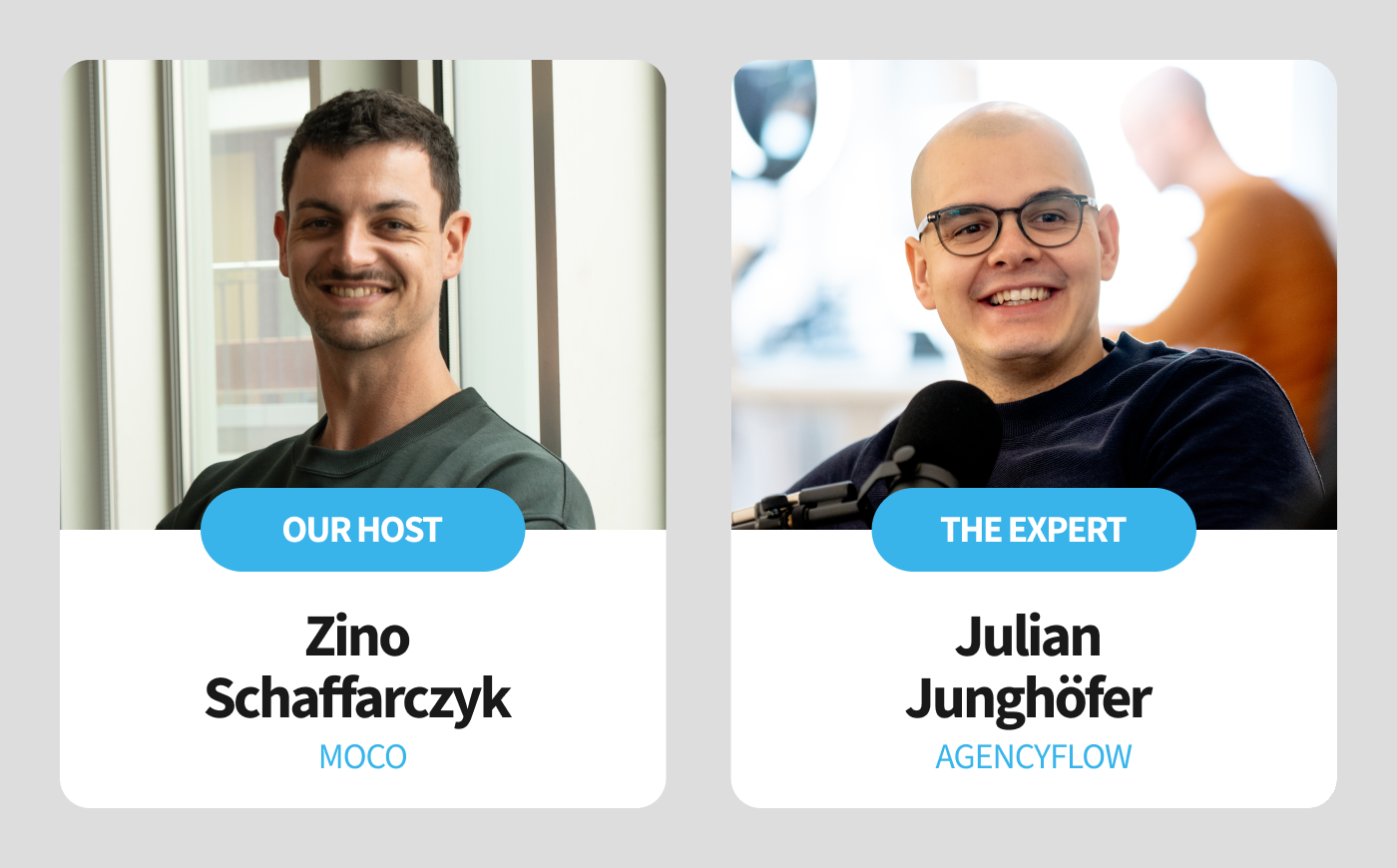 In diesem Webinar zeigen dir Julian Junghöfer von AGENCYFLOW und Zino Schaffarczyk von MOCO, wie du MOCO zum zentralen Steuerungstool für dein Kunden-Onboarding machst – inklusive intelligenter Vorlagen, Automatisierungen und Struktur, die wirklich funktioniert.
